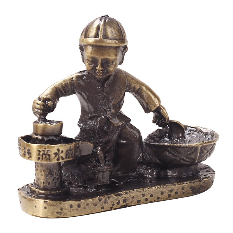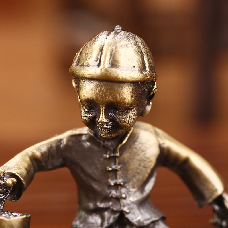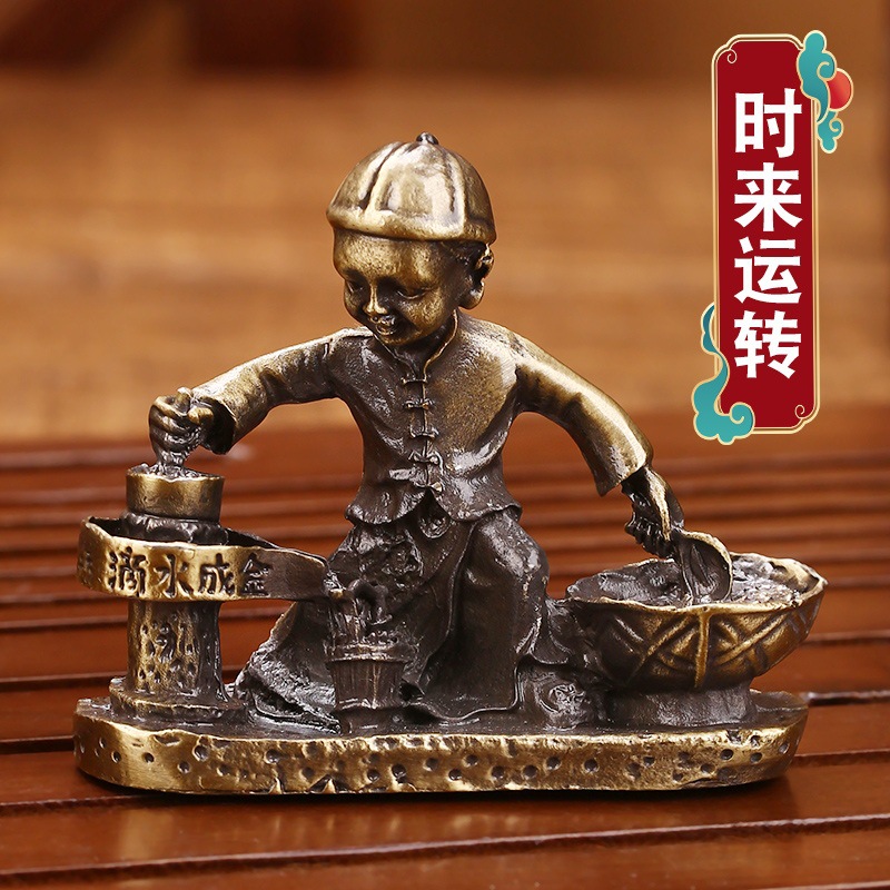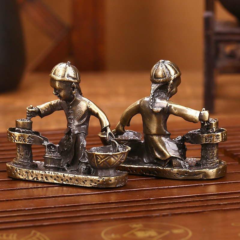LA755可发样/古玩收藏仿古做旧青铜色合金滴水成金童子推磨石磨金属工艺品摆件