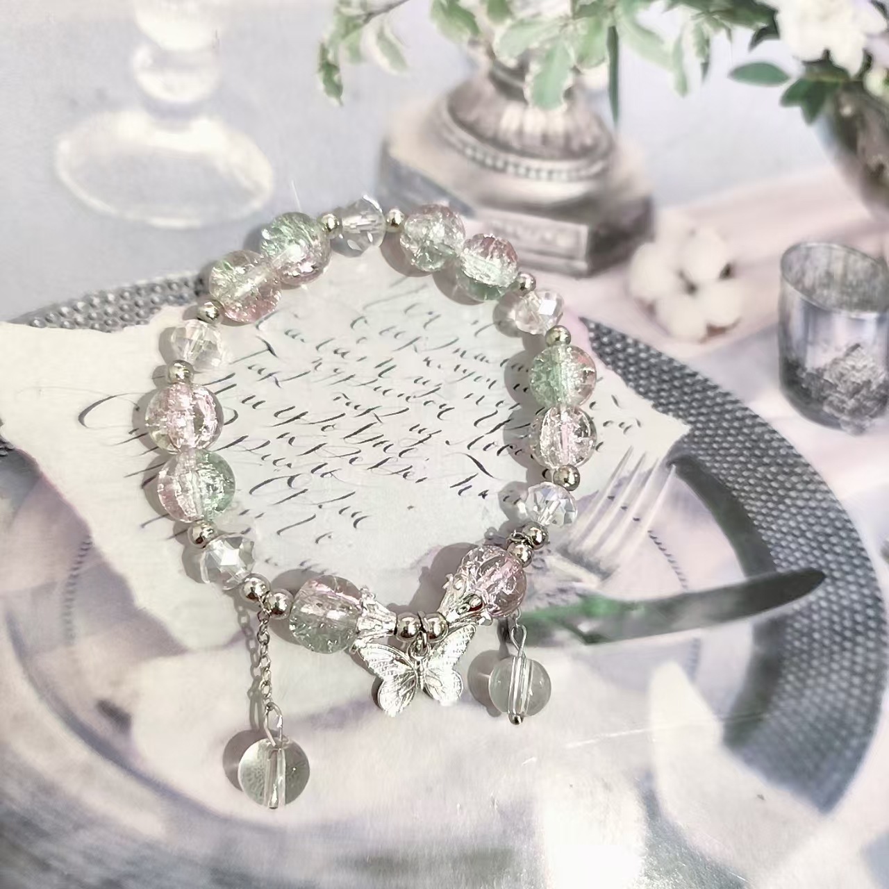 • S302 浅粉绿琉璃流苏蝴蝶手链