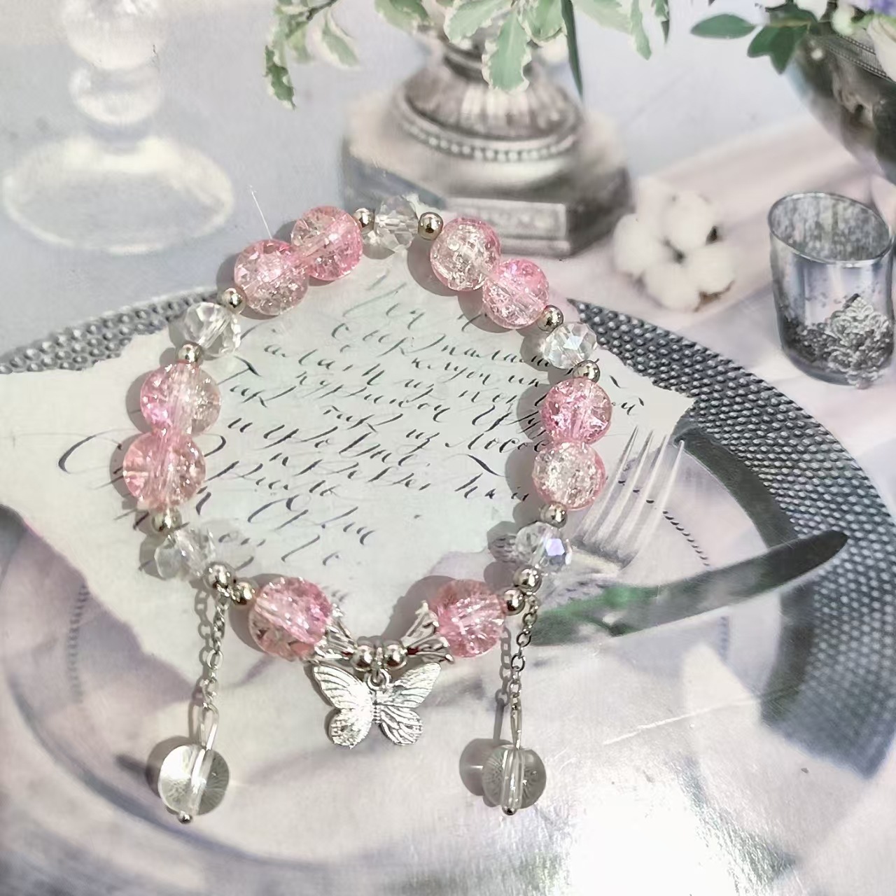 • S303 粉色琉璃流苏蝴蝶手链