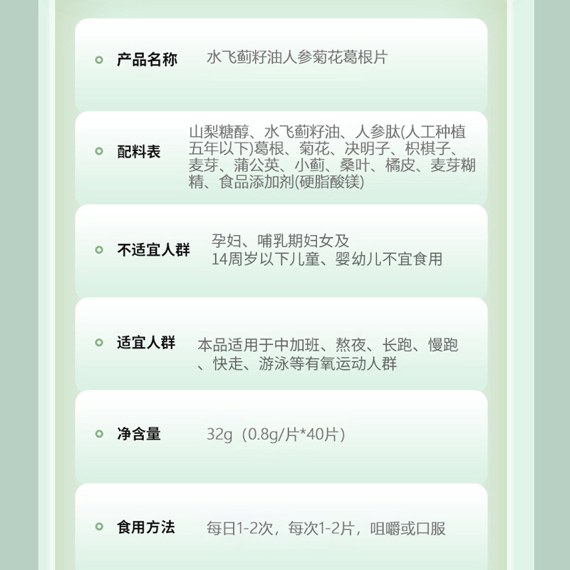 山梨糖醇、水飞面籽油、人参肽(人工种植五年以下)、葛根、菊花决明子、祝棋子、麦芽、蒲公英、小蓟、桑叶