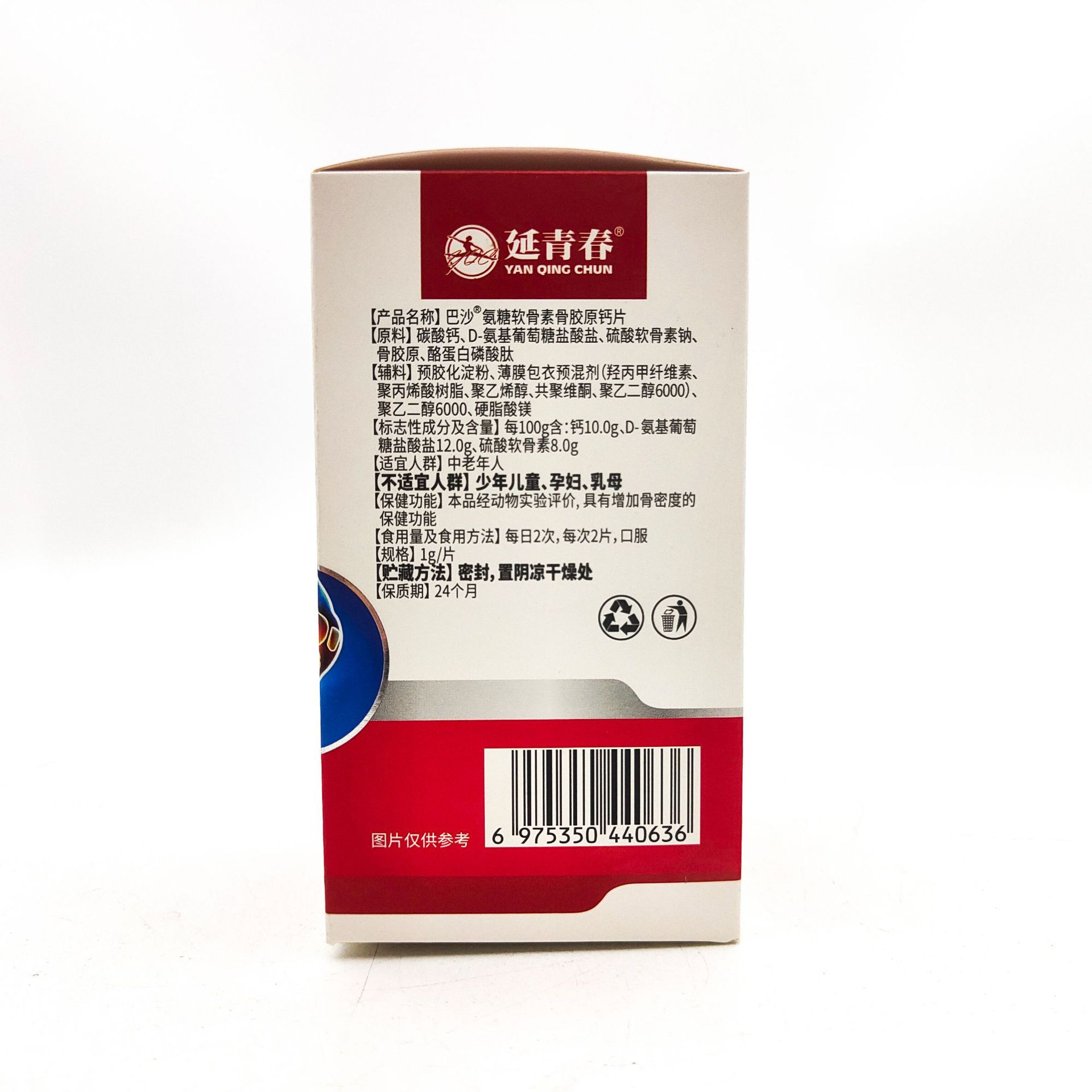 每100g含:钙10.0g、D-氨基葡萄 糖盐酸盐12.0g、硫酸软骨素8.0g