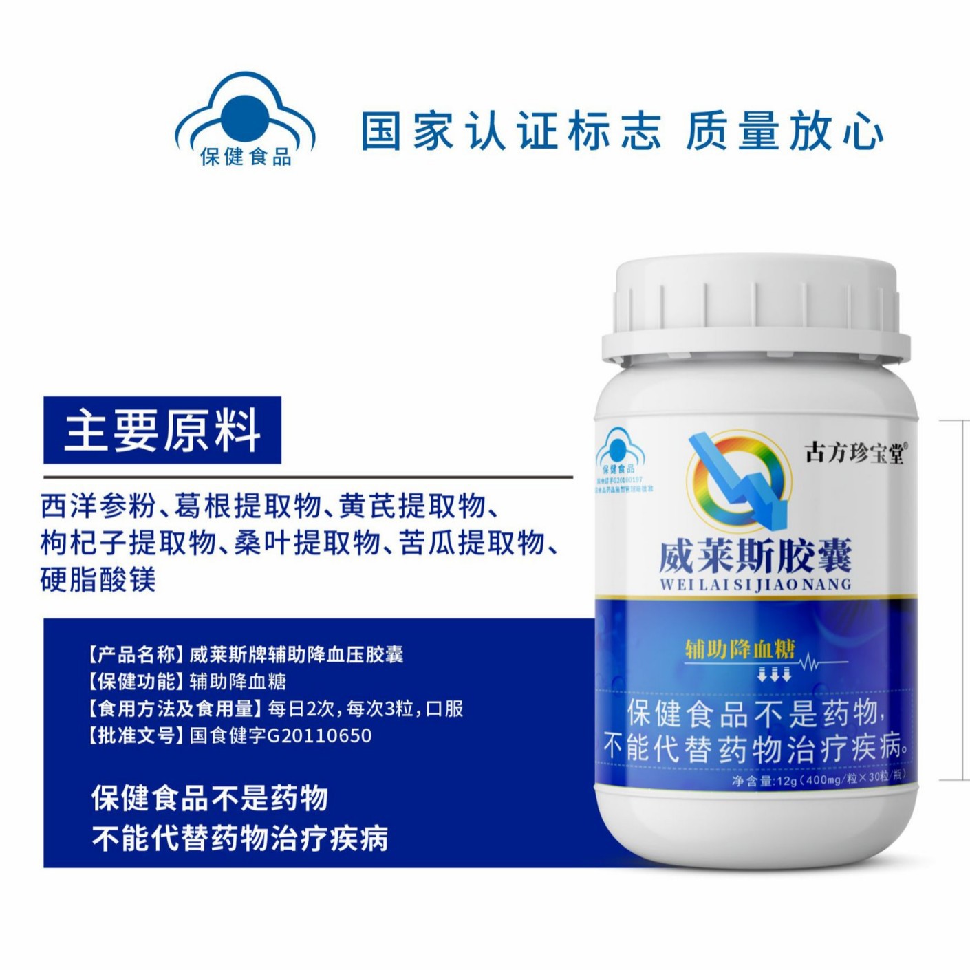 西洋参粉、葛根提取物、黄芪提取物、枸杞子提取物、桑叶提取物、苦瓜提取物、硬脂酸镁