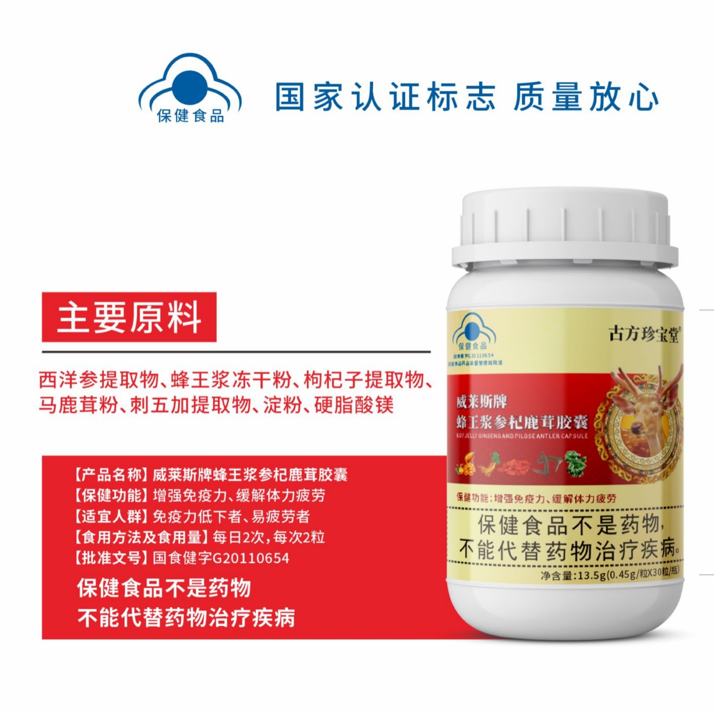 西洋参提取物、蜂王浆冻干粉、枸杞子提取物、马鹿茸粉、刺五加提取物、淀粉、硬脂酸镁