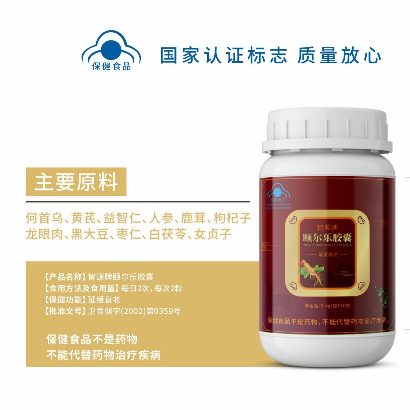 何首乌、黄芪、益智仁、人参、鹿茸、枸杞子、龙眼肉、黑大豆、枣仁、白茯苓、女贞子