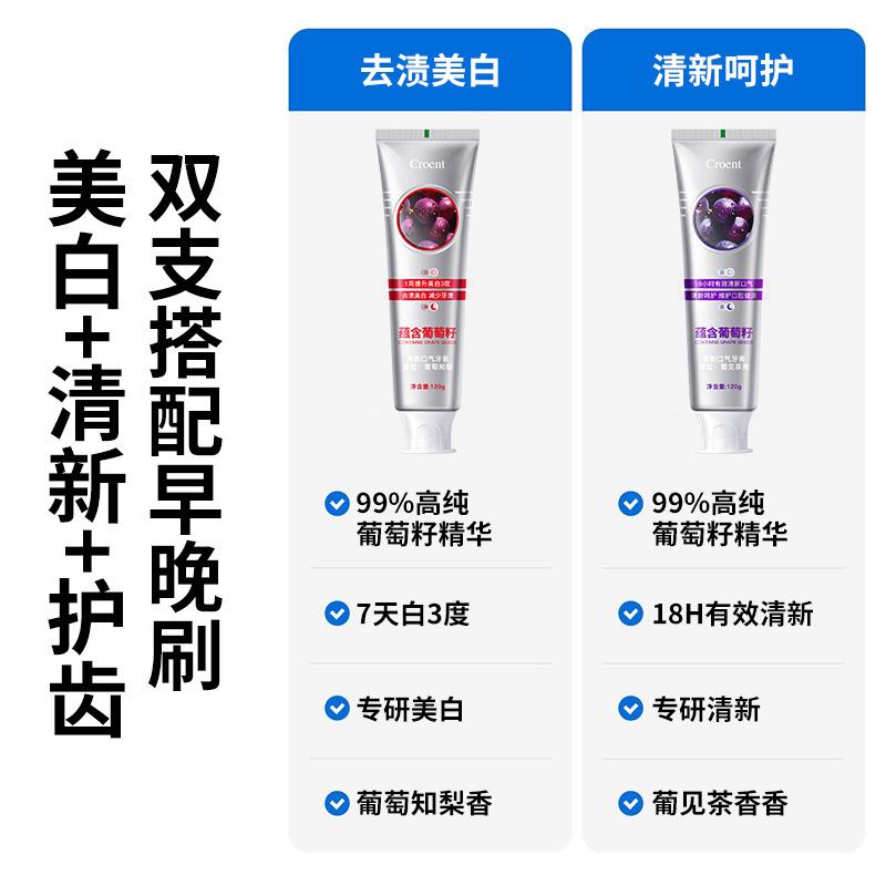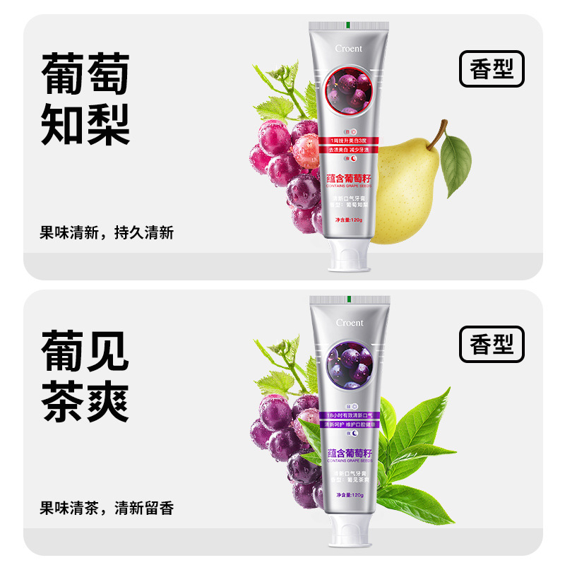 LA202可发样/Croent葡萄籽清新口气牙膏美白去渍减轻口臭呵护牙齿情侣装120g